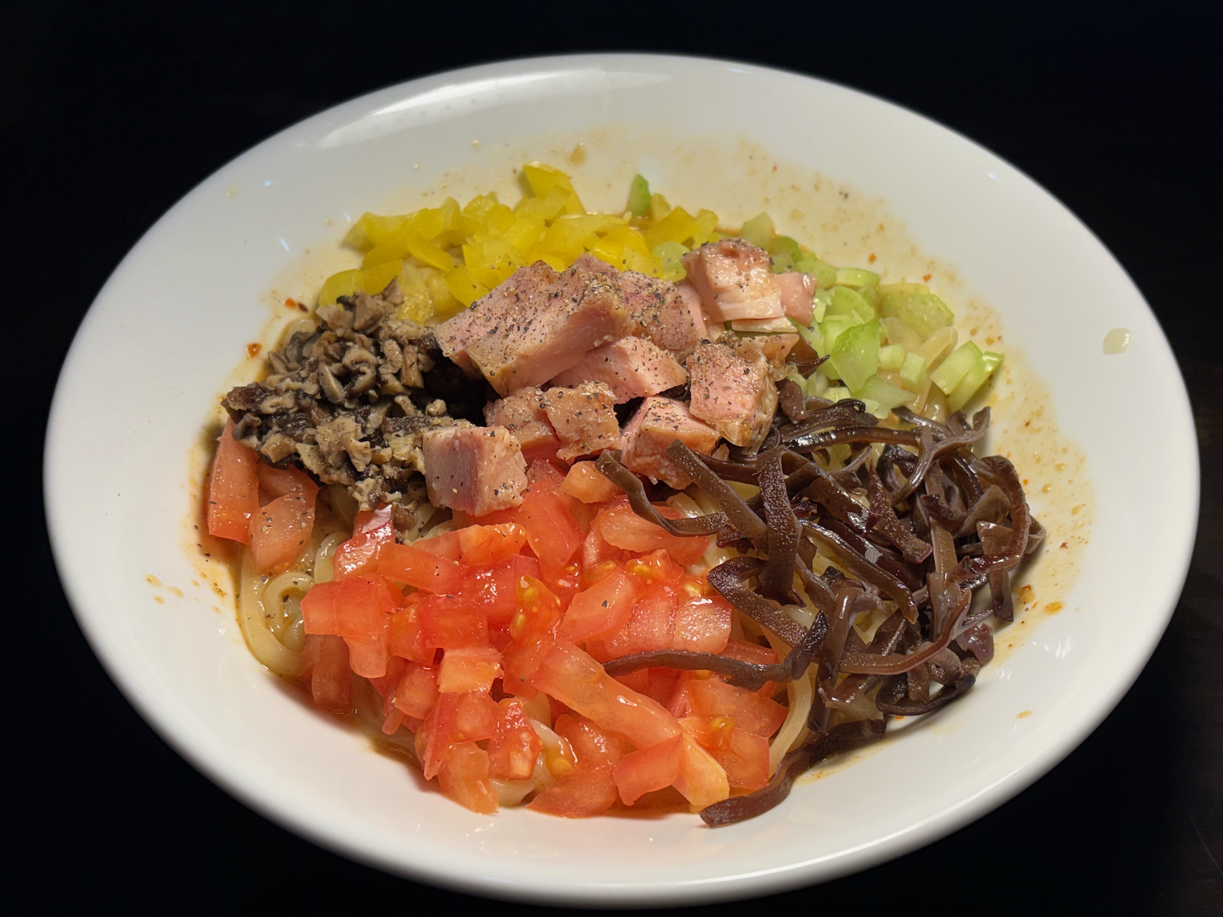 具は、鶏肉、セロリ、椎茸、パプリカ、キクラゲが入ってます。
